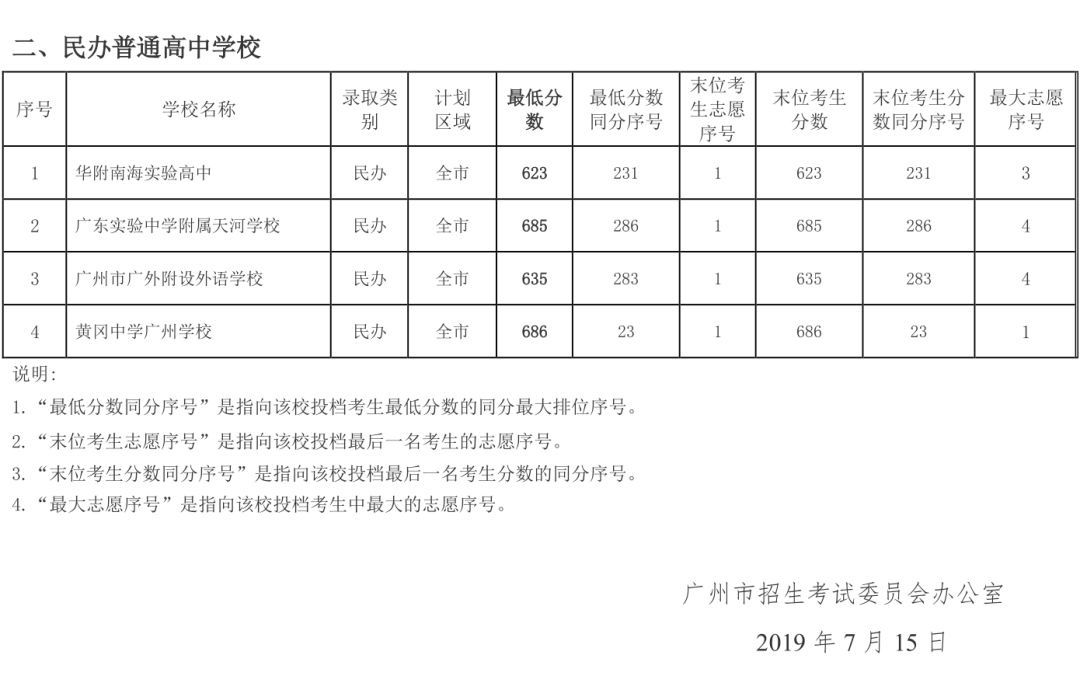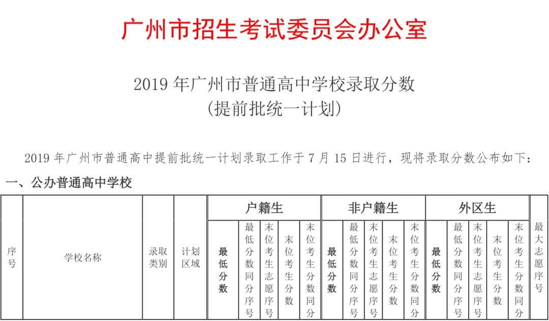 7月15日,广州招考办发布《2019年广州市普通高中学校录取分数(提前批统一计划)》。